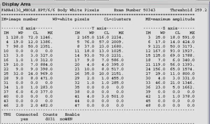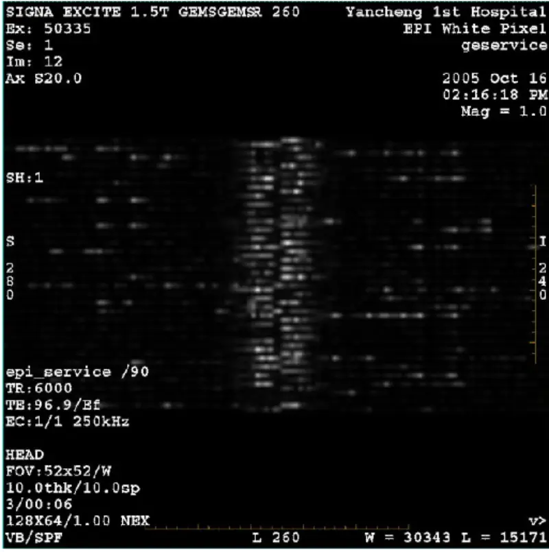 11. Odpojte vláknovou optiku X,Y a Z Gradient Drive na desce GP, skenování hlavy s bílými pixely EPT a těla. výsledek je pass. Znamená to, že bílý pixel je indukován gradientem. Je vidět, že bílý pixel není pouze na jedné ose. Poté vyměňte desku SGA PS, GP, ale problém přetrvává. Znovu připojte vláknovou optiku měniče s přechodem X,Y,Z.