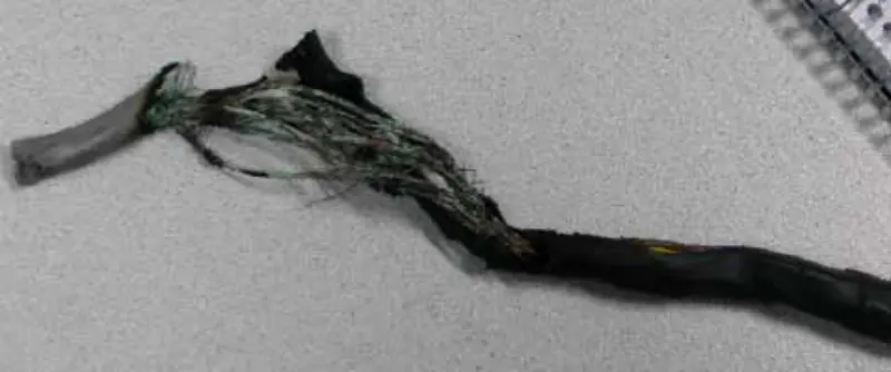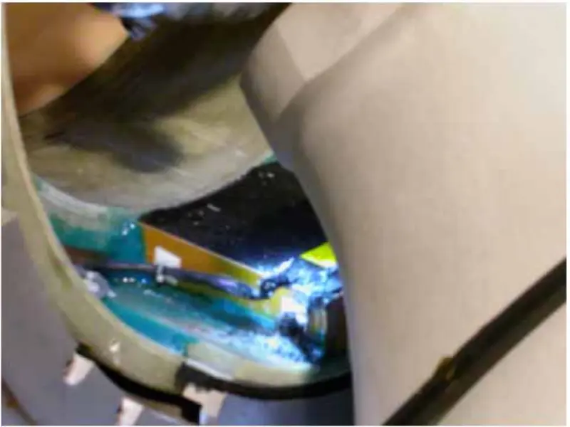 Z výše uvedené akce a analýzy docházíme k závěru, že problém by měl být způsoben gradientovou cívkou. Sejmeme tedy přední a zadní kryt magnetu, zkontrolujeme a utáhneme šrouby související s gradientní cívkou. Po sejmutí zadního krytu magnetu zjistíme, že lanko podložky bylo vypáleno do černé.